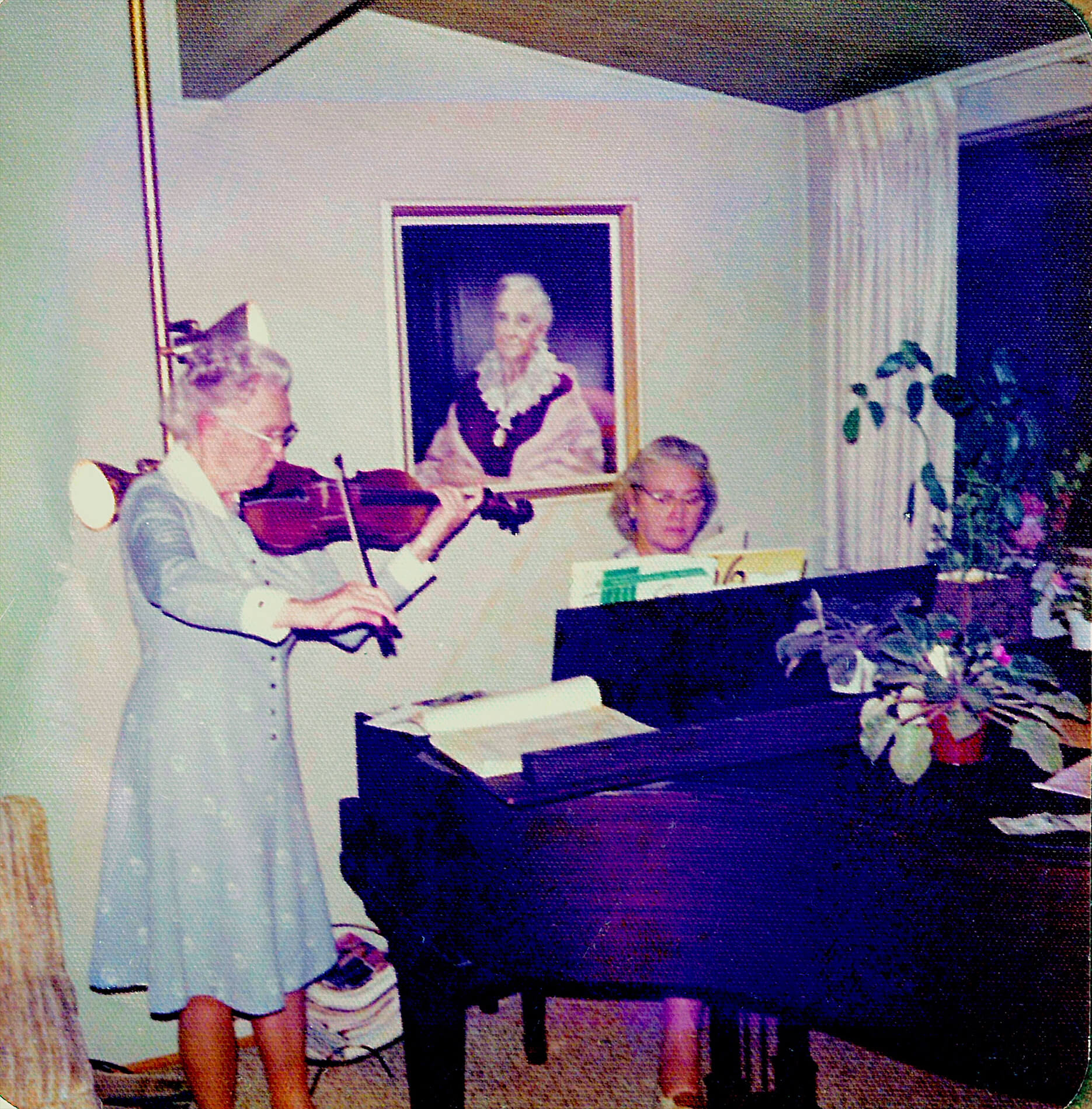 L to R - grandmother on violin, portrait of great grandmother, and mother on piano